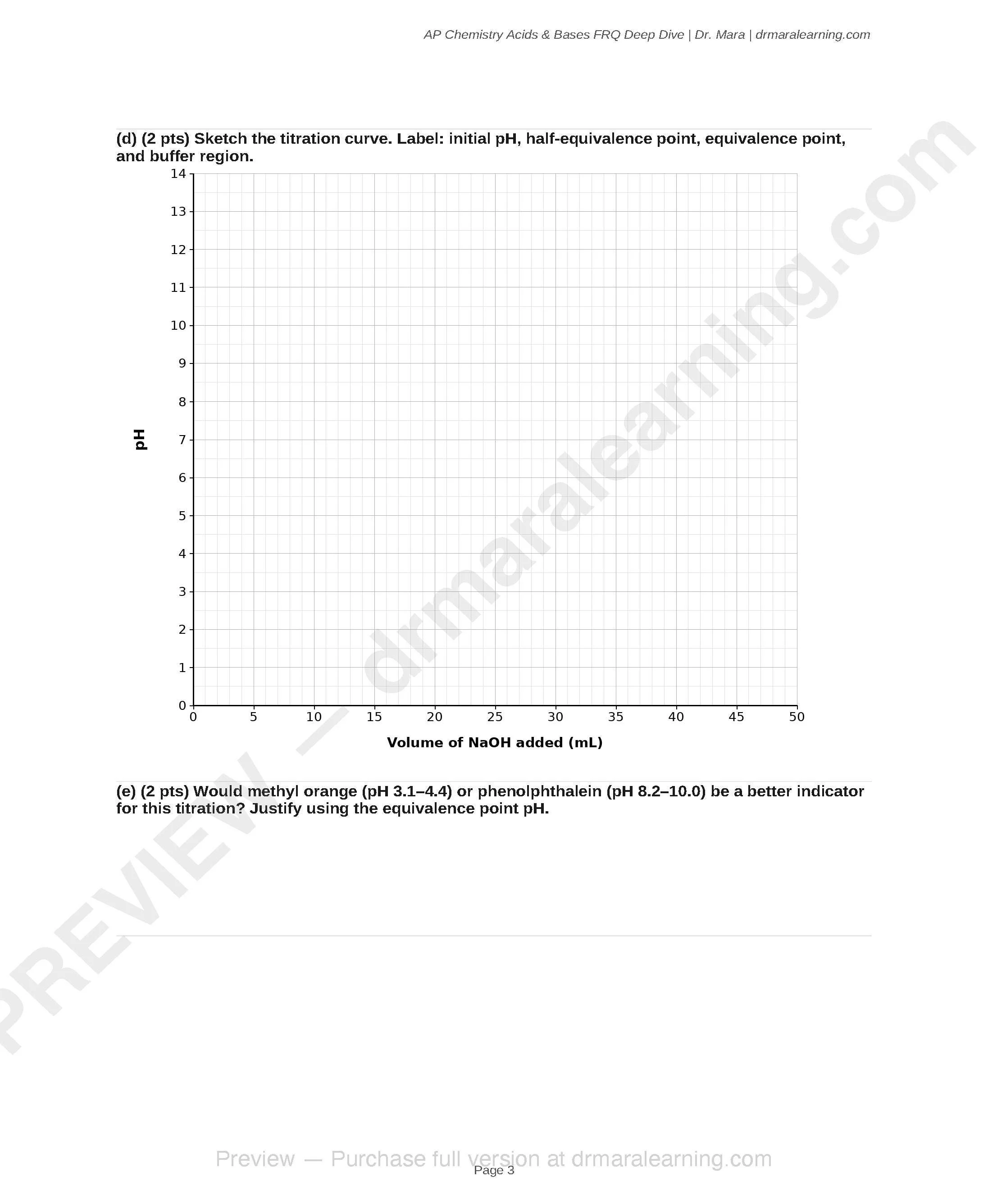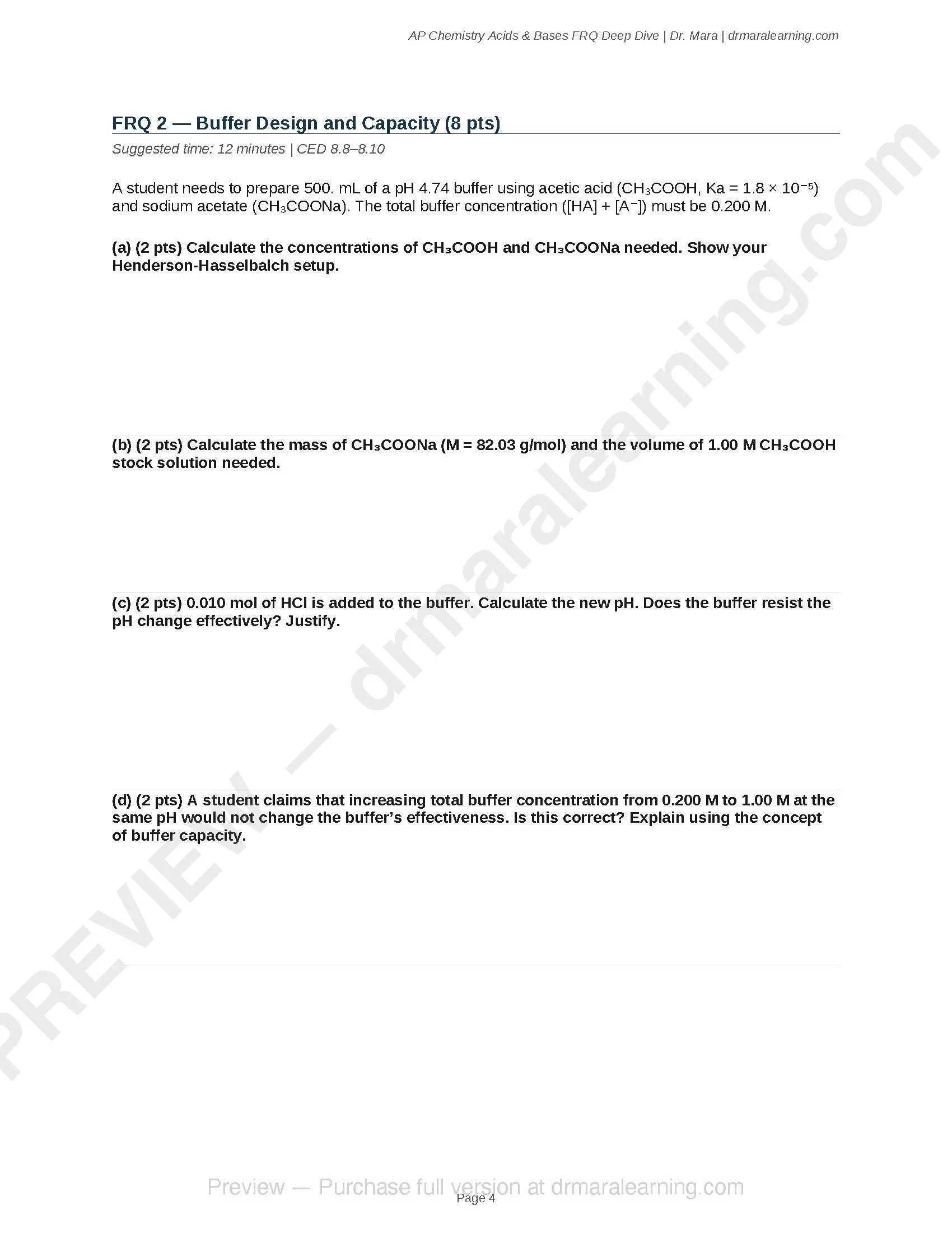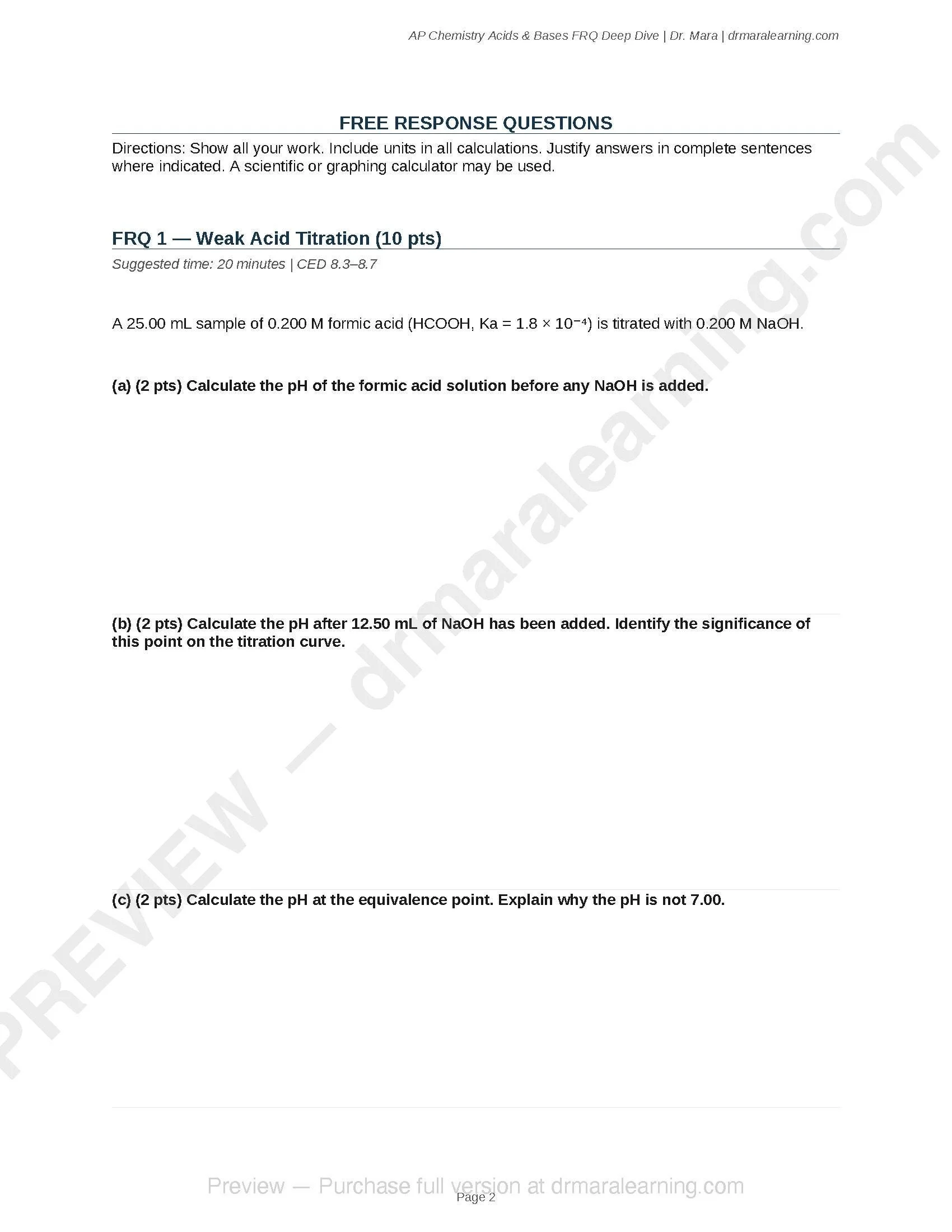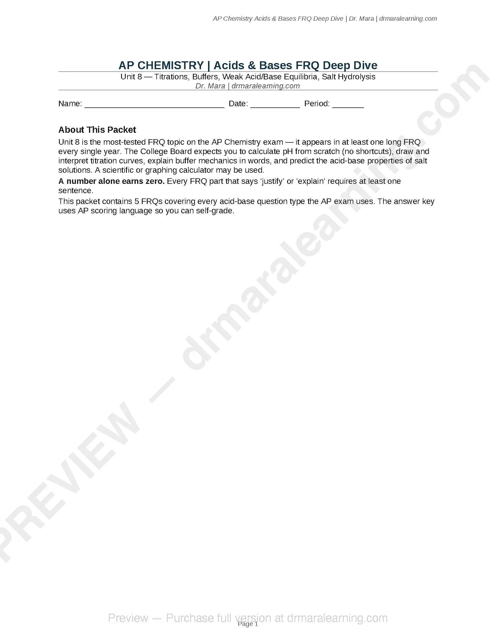 5 AP Chemistry free-response questions focused entirely on acids and bases — the topic tested on every single AP Chemistry exam. Instant digital download. Each FRQ comes with full worked solutions and scoring rubrics matching the College Board format. Covers titrations, buffers, polyprotic acids, Ksp/common ion, and unknown acid identification. Written by a PhD chemist. Editable Word (.docx) format.